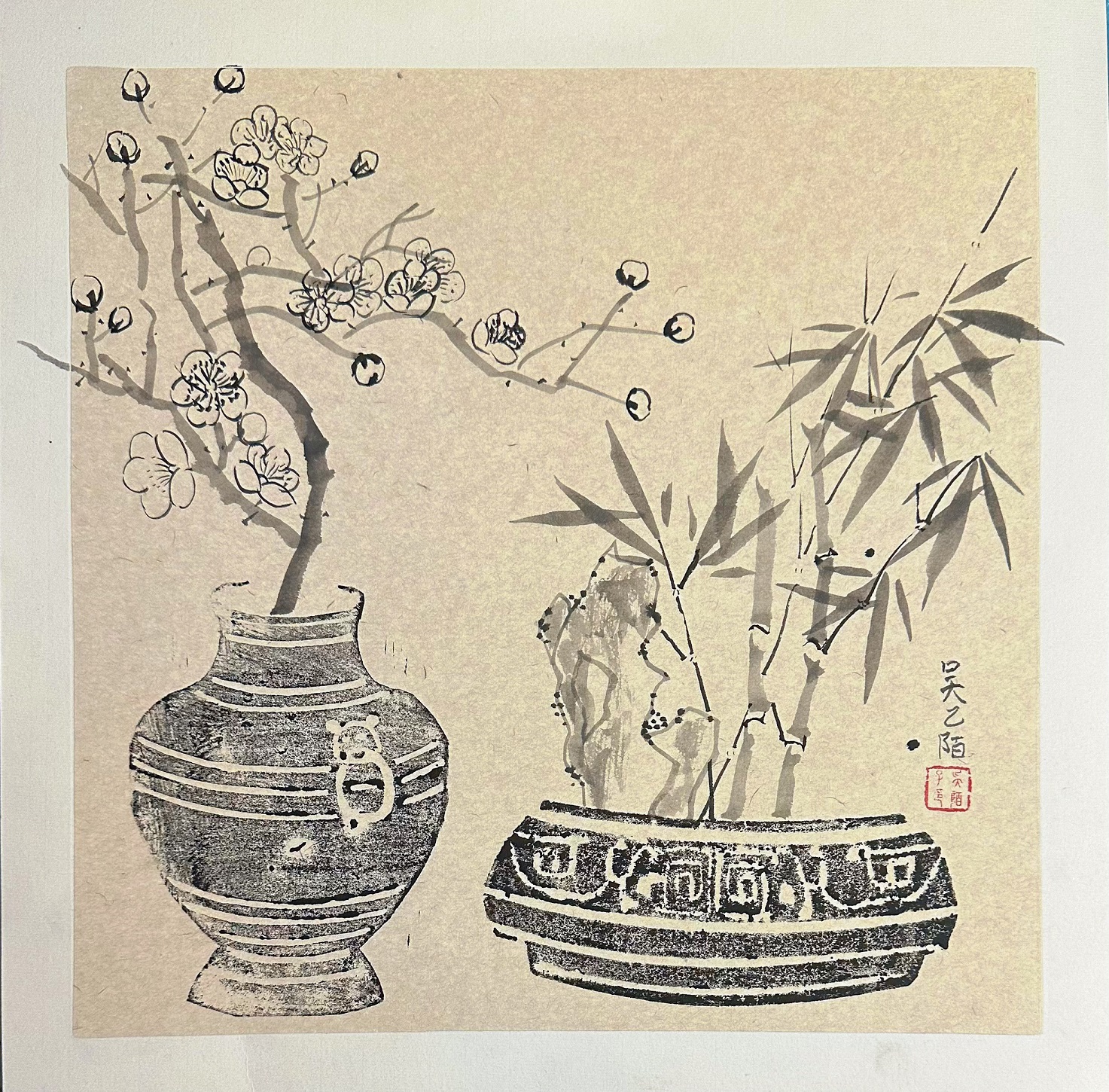 瓶花竹石图